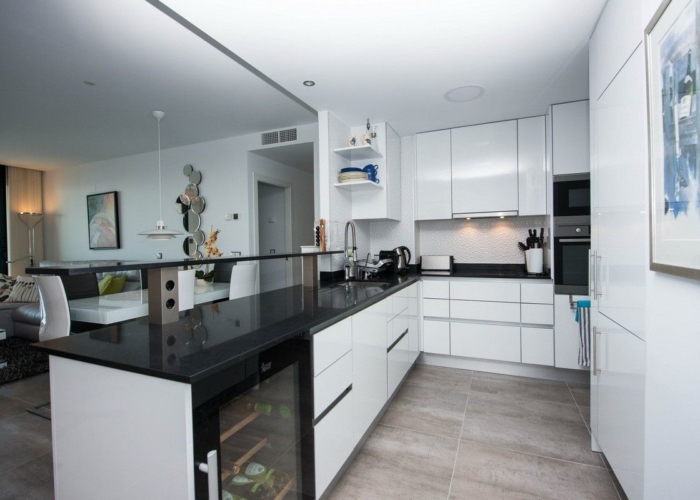 Cuisine ouverte avec lave-vaisselle, lave-linge et sèche-linge.
